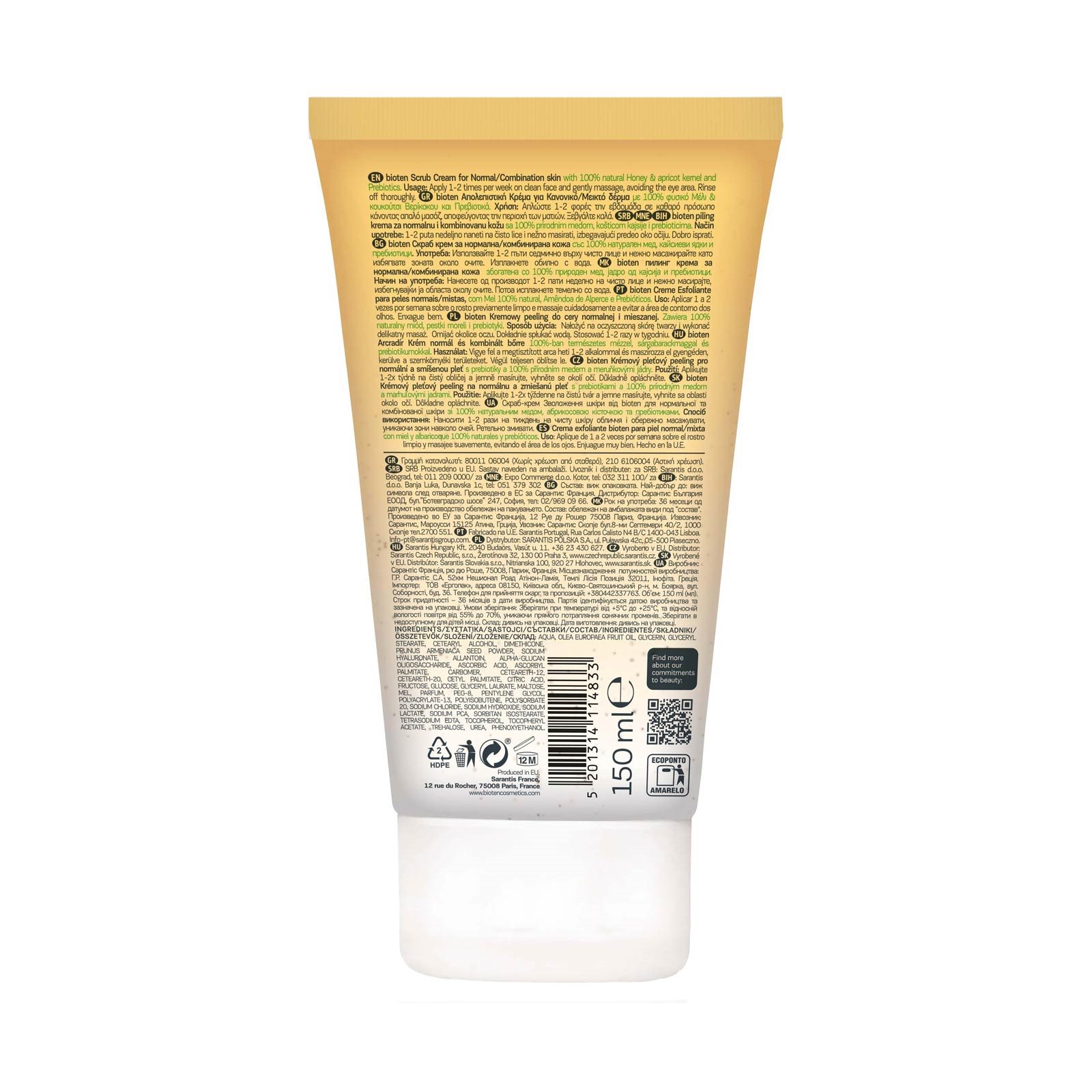 Η Απολεπιστική κρέμα bioten για Κανονικές/ Μεικτές επιδερμίδες με 94% συστατικά φυσικής προέλευσης είναι εμπλουτισμένη με 100% φυσικό μέλι και κουκούτσι βερίκοκου. Το Μέλι, ένας φυσικός ενυδατικός παράγοντας, βοηθάει το δέρμα να διατηρήσει το ιδανικό επίπεδο υγρασίας, ενώ οι κόκκοι από κουκούτσι Βερίκοκου διασφαλίζουν μία ήπια απολέπιση, βελτιώνοντας τον τόνο και την υφή της επιδερμίδας.