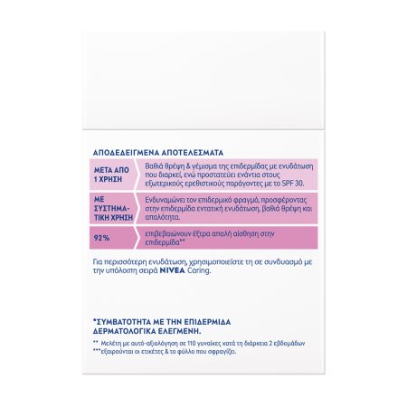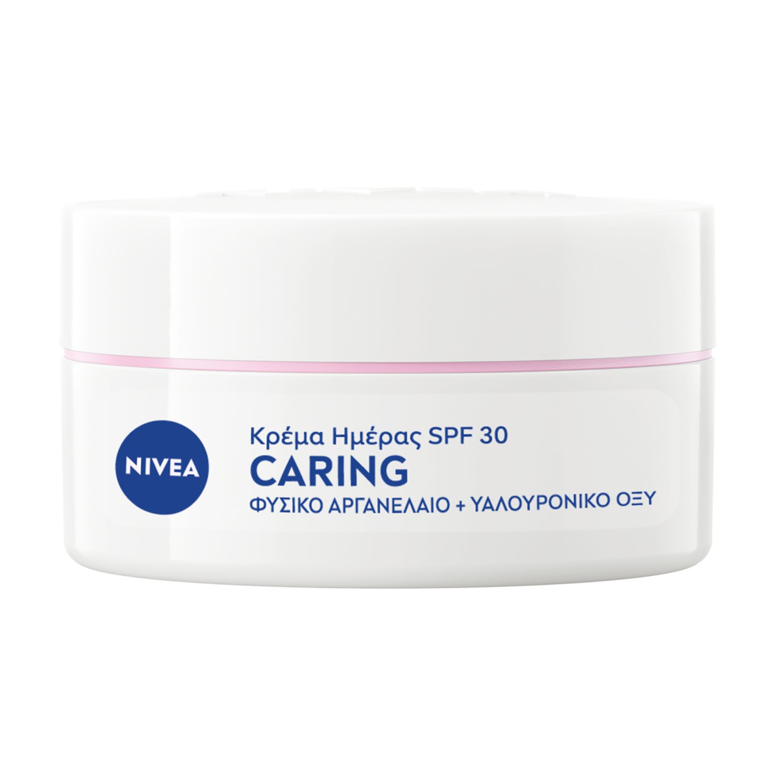 Η Κρέμα Ημέρας Caring της NIVEA είναι εμπλουτισμένη με φυσικό Αργανέλαιο και Υαλουρονικό Οξύ. Η σύνθεση είναι ειδικά αναπτυγμένη για άτομα με ξηρή επιδερμίδα. Προστατεύει ενάντια στην ηλιακή ακτινοβολία που προκαλεί βλάβη στην επιδερμίδα και πρόωρη γήρανση. Θρέφει βαθιά και χαρίζει απαλότητα στην επιδερμίδα, ενώ ενυδατώνει εντατικά για 48 ώρες, εξισορροπώντας τα επίπεδα υγρασίας της ίδιας της επιδερμίδας. Αποκτήστε απαλή και βαθιά ενυδατωμένη επιδερμίδα, όλη μέρα. Η συμβατότητα αυτής της πρωινής περιποίησης με την επιδερμίδα είναι δερματολογικά ελεγμένη.