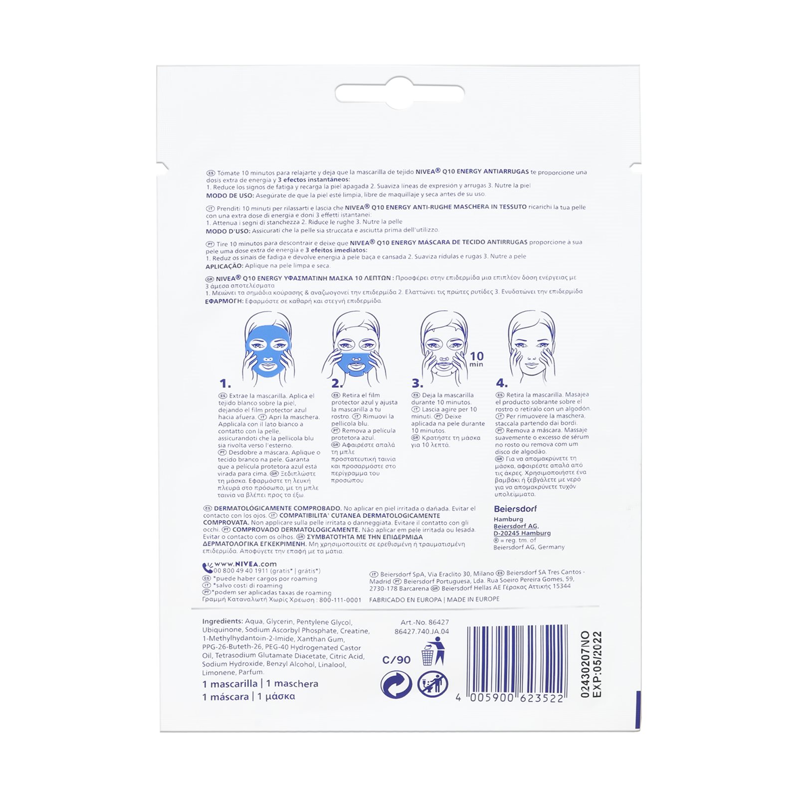 Υφασμάτινη μάσκα για αναπλήρωση ενέργειας με σύνθεση που περιέχει δύο αντιοξειδωτικά, συνένζυμο Q10 και βιταμίνης C.