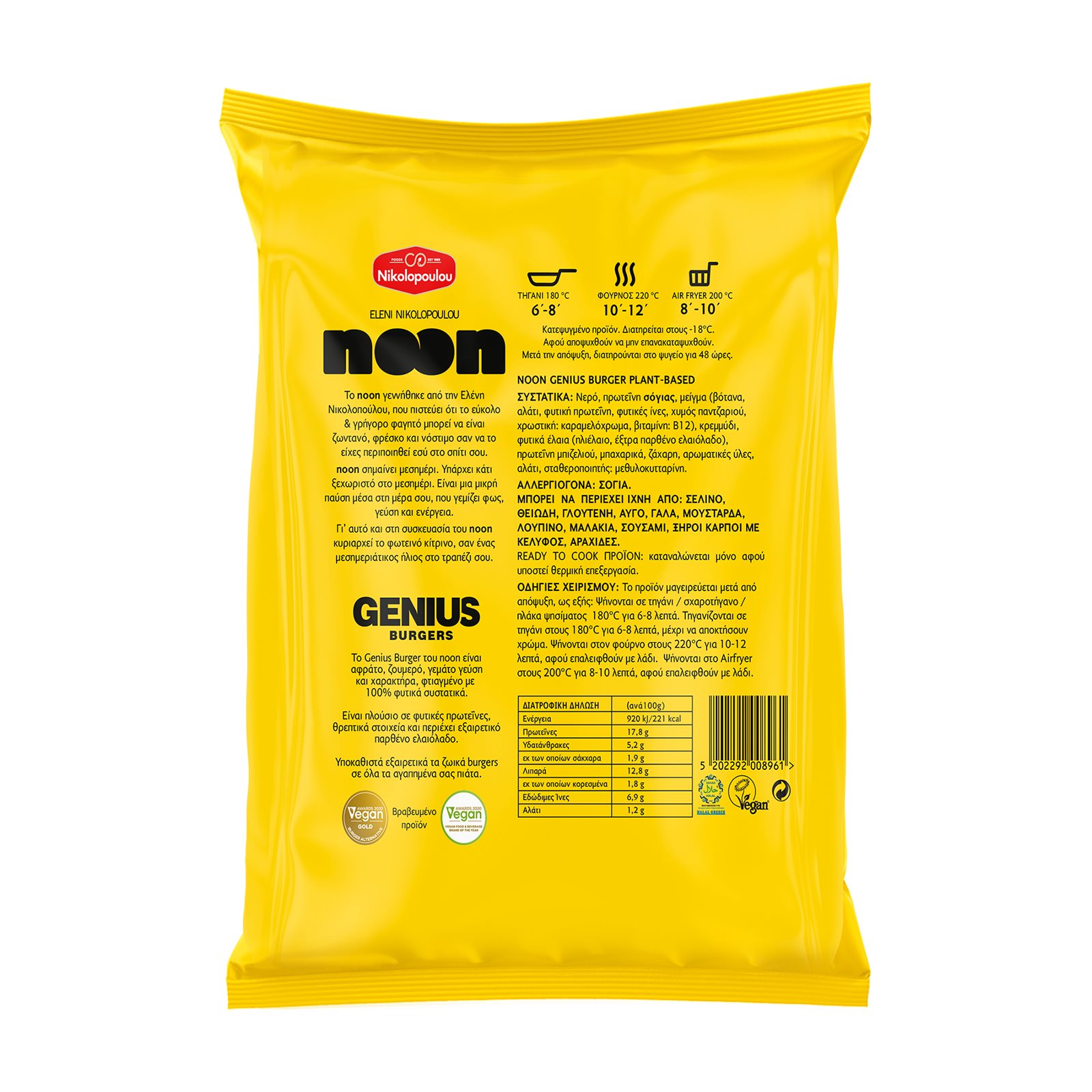 Νερό, πρωτεΐνη ΣΟΓΙΑΣ, μείγμα (βότανα, αλάτι, φυτική πρωτεΐνη, φυτικές ίνες, χυμός παντζαριού, χρωστική: καραμελόχρωμα, βιταμίνη Β12), κρεμμύδι, φυτικά έλαια (ηλιέλαιο, έξτρα παρθένο ελαιόλαδο), πρωτεΐνη μπιζελιού, μπαχαρικά, ζάχαρη, αρωματικές ύλες,