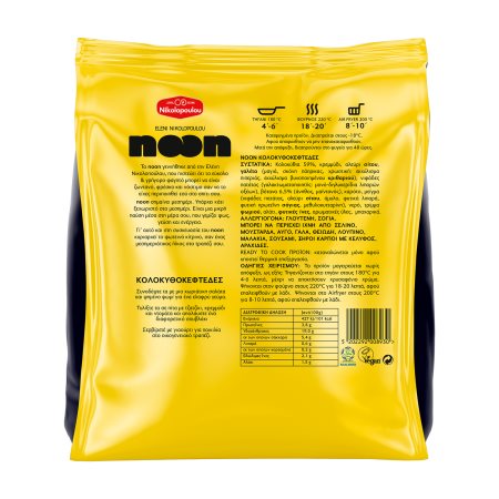Κολοκύθια 59%, κρεμμύδι, αλεύρι ΣΙΤΟΥ, γαλέτα (μαγιά, σκόνη πάπρικας, χρωστική: εκχύλισμα πιπεριάς, εκχύλισμα βυνοποιημένου ΚΡΙΘΑΡΙΟΥ), νιφάδες πατάτας (γαλακτωματοποιητής: μονό-διγλυκερίδια λιπαρών οξέων), βότανα 6,5% (άνηθος, μαϊντανός), καρότο, μείγμα (νιφάδες πατάτας, αλεύρι ΣΙΤΟΥ, άμυλο, φυτικά λιπαρά, φυτική πρωτεΐνη ΣΟΓΙΑΣ, μεθυλοκυτταρίνη), νερό, τρίμμα ψωμιού, αλάτι, φυτικές ίνες, αρωματικές ύλες, μπαχαρικά.