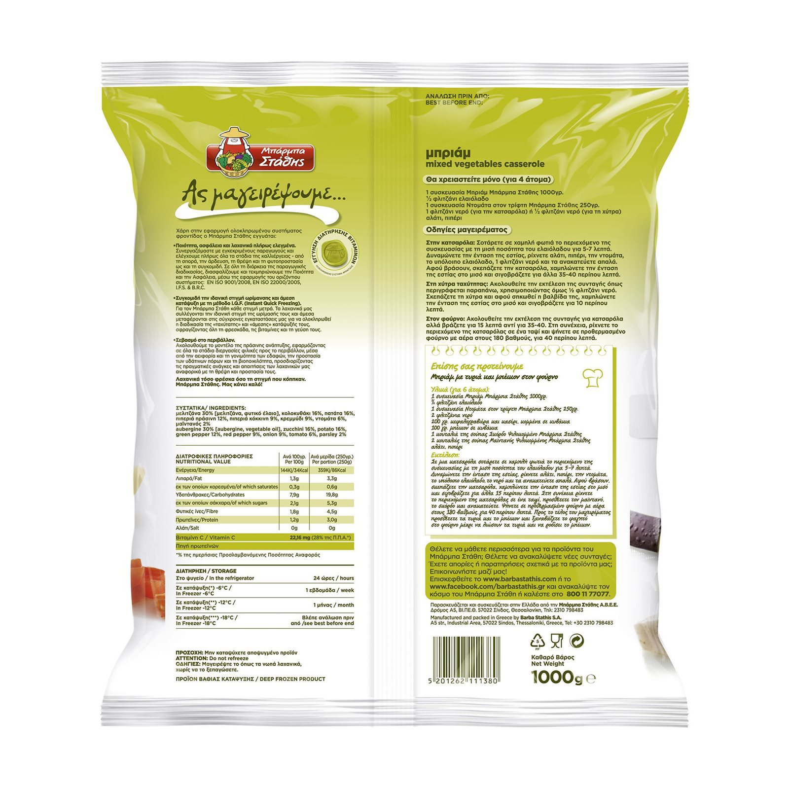 Μελιτζάνα 30% (μελιτζάνα, φυτικό έλαιο), κολοκυθάκι 16%, πατάτα 16%, πιπεριά πράσινη 12%, πιπεριά κόκκινη 9%, κρεμμύδι 9%, ντομάτα 6%, μαϊντανός 2%.