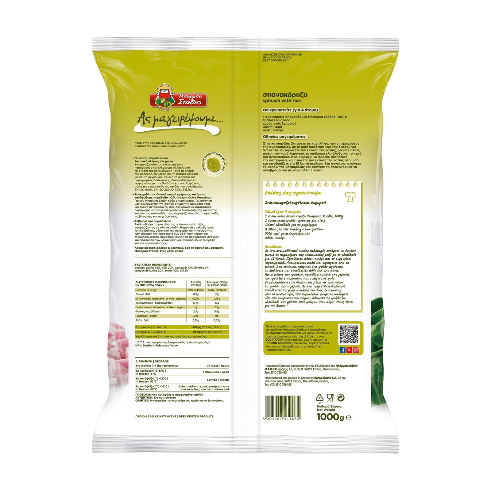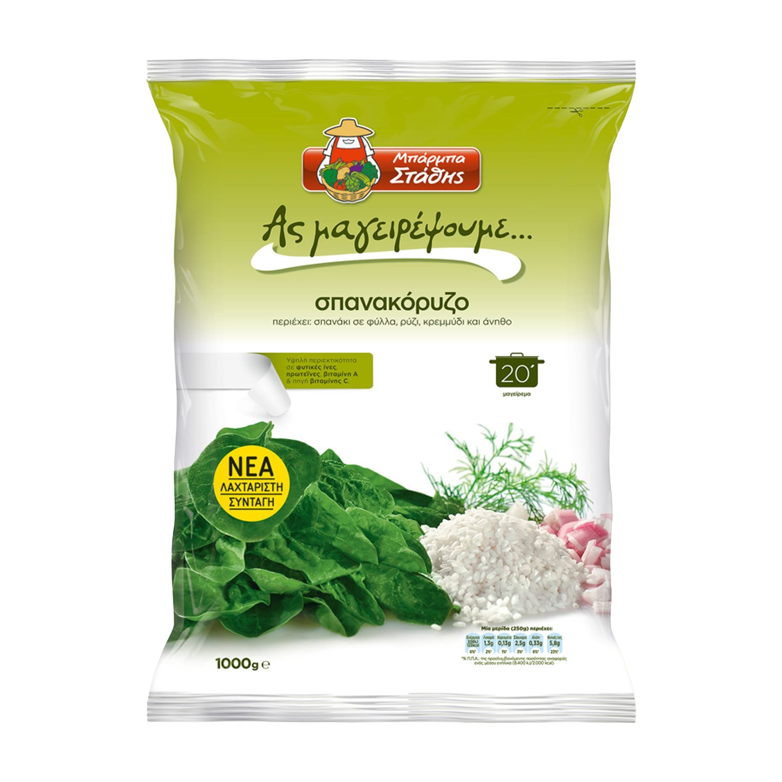 Σπανάκι φύλλο 68%, ρύζι 20%, κρεμμύδι 10%, άνηθος 2%.