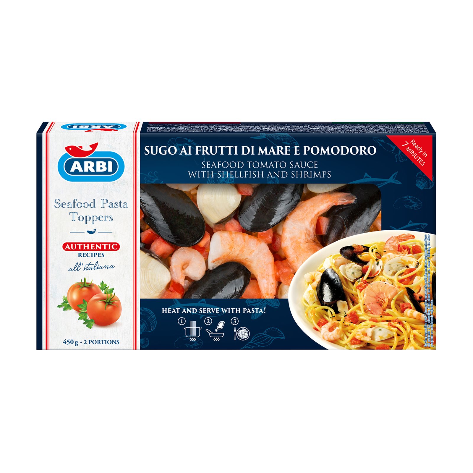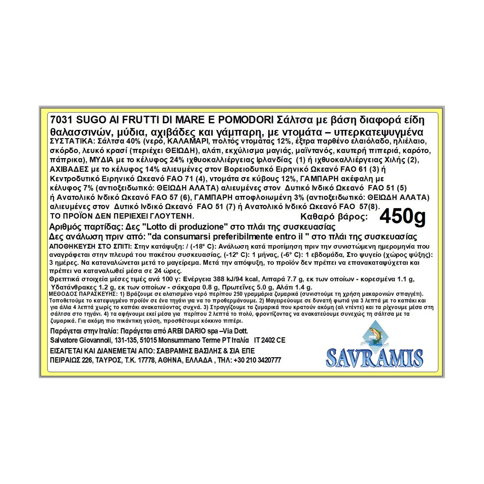 Σάλτσα 40% [νερό, ΚΑΛΑΜΑΡΙ 16%, πολτός ντομάτας 12%, έξτρα παρθένο ελαιόλαδο, ηλιέλαιο, σκόρδο, λευκό κρασί (περιέχει ΘΕΙΩΔΗ), αλάτι, εκχύλισμα μαγιάς, μαϊντανός, καυτερή πιπεριά, καρότο, πάπρικα], ΜΥΔΙΑ με κέλυφος 24% ιχθυοκαλλιέργειας Ιρλανδίας (1) ή ιχθυοκαλλιέργειας Χιλής (2), ΑΧΙΒΑΔΕΣ με το κέλυφος 14% αλιευμένες στον Βορειοδυτικό Ειρηνικό Ωκεανό FAO61 (3) ή Κεντροδυτικό Ειρηνικό Ωκεανό FAO71 (4), ντομάτα σε κύβους 12%, ΓΑΜΠΑΡΗ ακέφαλη με κέλυφος 7% (αντιοξειδωτικό: ΘΕΙΩΔΗ ΑΛΑΤΑ) αλιευμένες στον Δυτικό Ινδικό Ωκεανό FAO51 (5) ή Ανατολικό Ινδικό Ωκεανό FAO57 (6), ΓΑΜΠΑΡΗ αποφλοιωμένη 3% (αντιοξειδωτικό: ΘΕΙΩΔΗ ΑΛΑΤΑ) αλιευμένες στον Δυτικό Ινδικό Ωκεανό FAO51 (7) ή Ανατολικό Ινδικό Ωκεανό FAO57 (8).