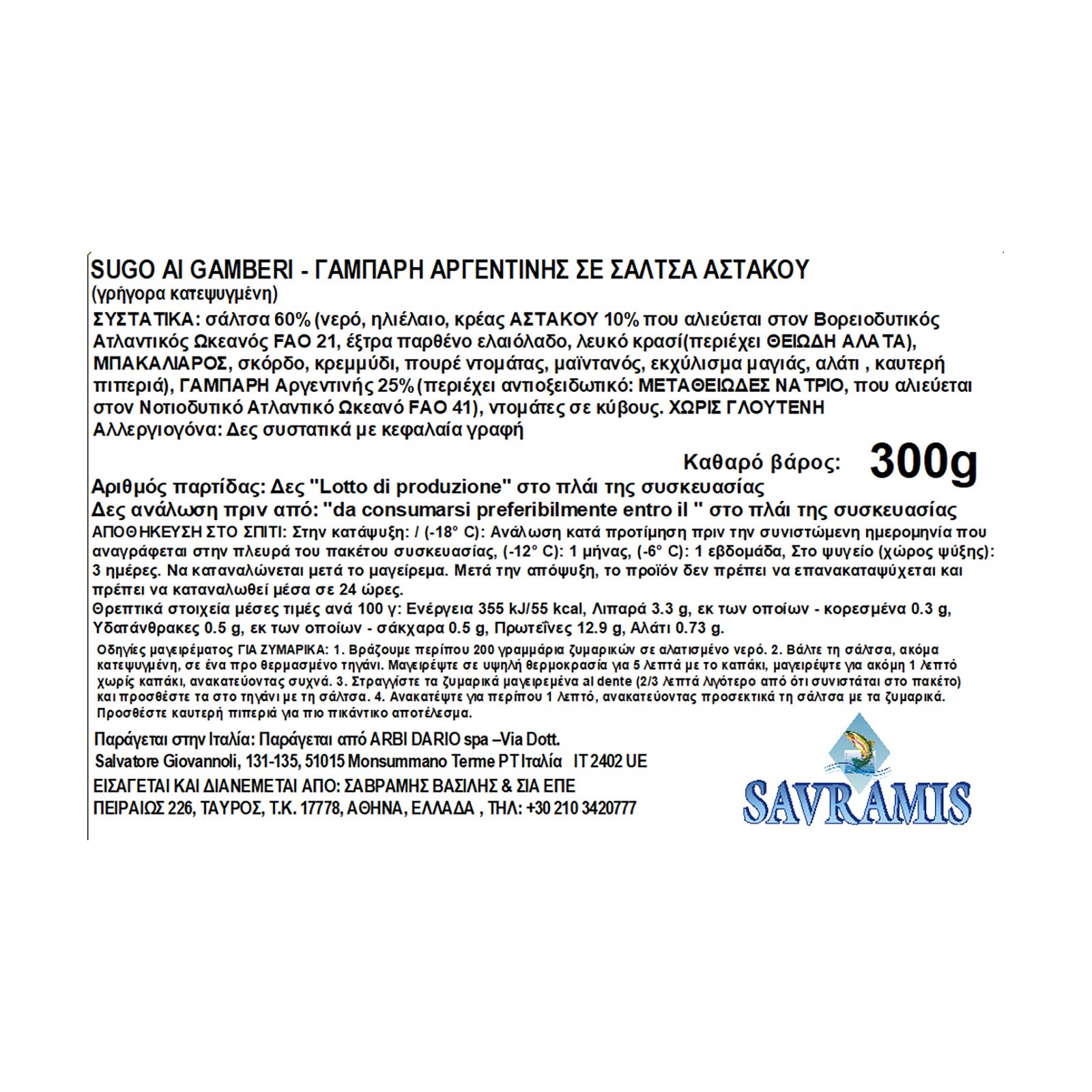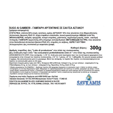 Σάλτσα 60% (νερό, ηλιέλαιο, κρέας ΑΣΤΑΚΟΥ 10% που αλιεύεται στον Βορειοδυτικός Ατλαντικός Ωκεανός FAO21, έξτρα παρθένο ελαιόλαδο, λευκό κρασί (περιέχει ΘΕΙΩΔΗ ΑΛΑΤΑ), ΜΠΑΚΑΛΙΑΡΟΣ, σκόρδο, κρεμμύδι, πουρέ ντομάτας, μαϊντανός, εκχύλισμα μαγιάς, αλάτι, καυτερή πιπεριά), ΓΑΛΑΜΠΑΡΗ Αργεντινής 25% (περιέχει αντιοξειδωτικό: ΜΕΤΑΔΙΘΕΙΩΔΕΣ ΝΑΤΡΙΟ, που αλιεύεται στον Νοτιοδυτικό Ατλαντικό Ωκεανό FAO41), ντομάτες σε κύβους.