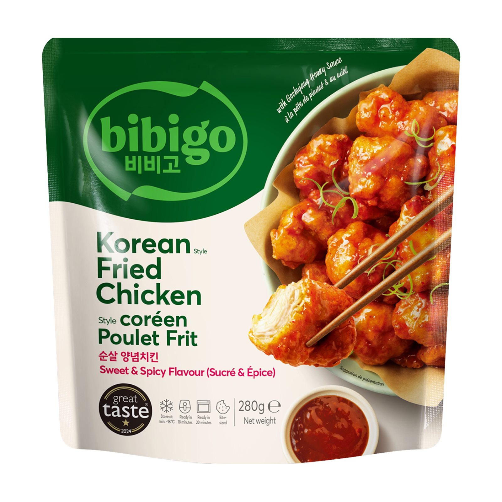 Σάλτσα: Νερό, ζάχαρη (30%), πράσινο alchan gochujang (29%) (σιρόπι καλαμποκιού, αλεύρι ΣΙΤΟΥ, νερό, πάστα καρυκευμένης κόκκινης πιπεριάς (κόκκινη πιπεριά σε σκόνη, νερό, αλάτι, κρεμμύδι, σκόρδο), αποβουτυρωμένη ΣΟΓΙΑ σε σκόνη, αλάτι, ΣΙΤΑΡΙ, σκόνη ρυζιού (ρύζι, ΣΙΤΑΡΙ), αλκοόλη, κόκκινη πιπεριά σε σκόνη, βύνη (ΣΙΤΑΡΙ), πελτές ντομάτας, σκόρδο, μέλι, ξίδι, εκχύλισμα μαγιάς (μαγιά, αλάτι), αλάτι, τροποποιημένο άμυλο, πυκνωτικά: ξανθανικό κόμμι, μαύρο πιπέρι σε σκόνη, καυτερή πιπεριά σε σκόνη, γλυκαντικά: ακεσουλφάμη Κ, γλυκοζίτες στεβιόλης από στέβια.