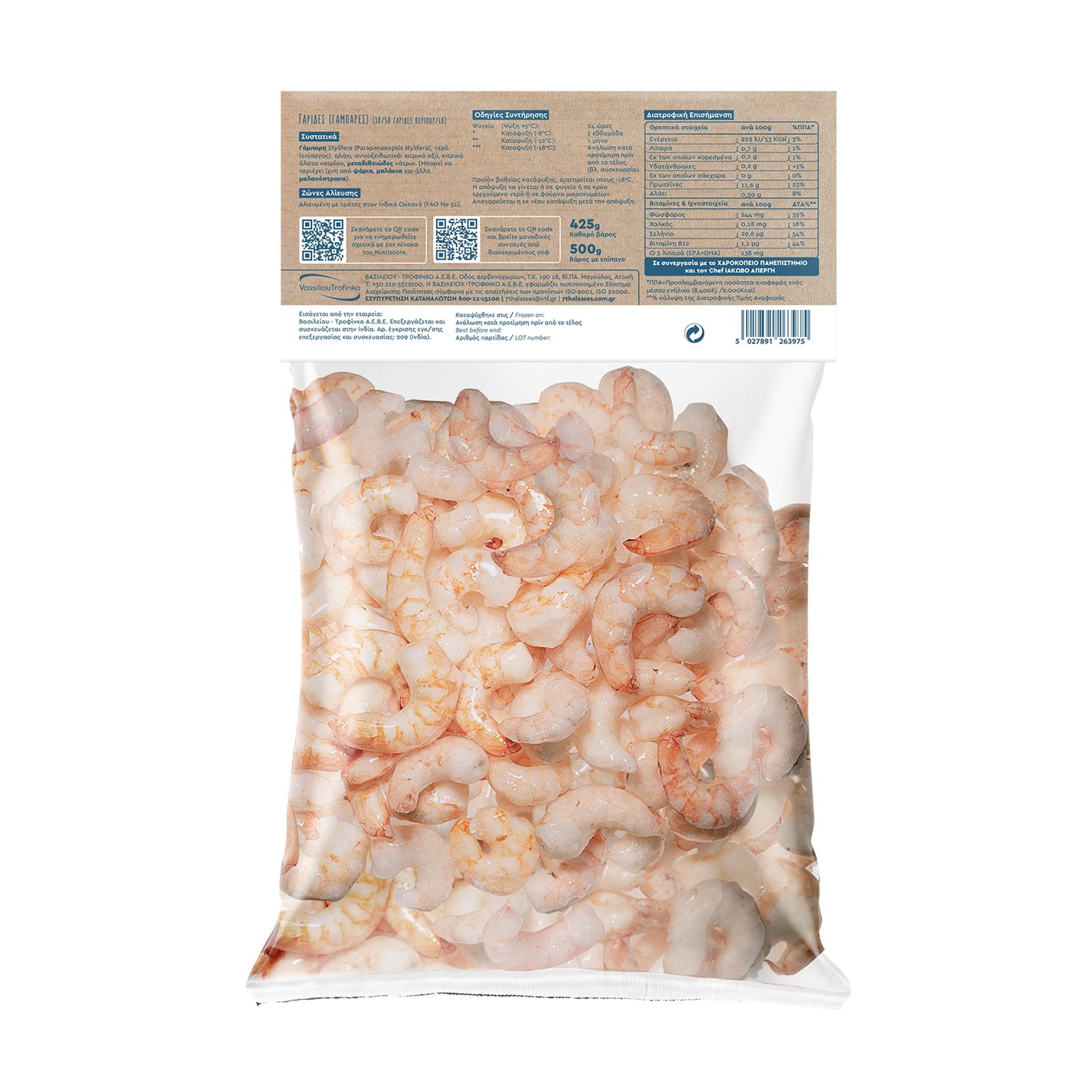 Γάμπαρη Stylifera (Parapenaeopsis stylifera), νερό (επίπαγος), αλάτι, αντιοξειδωτικά: κιτρικό οξύ, κιτρικά άλατα νατρίου, μεταδιθειώδες νάτριο.