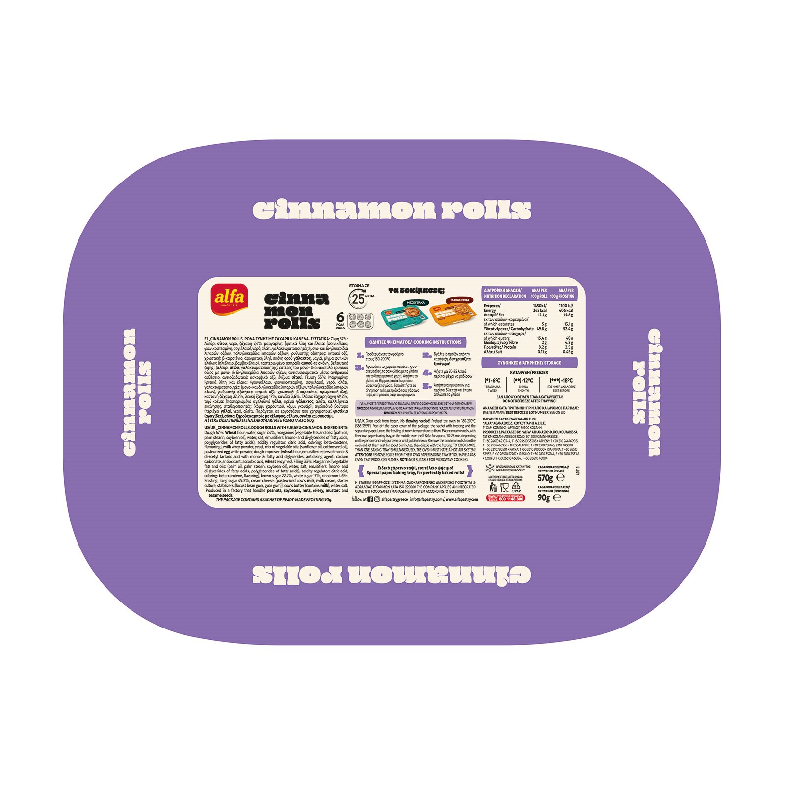 Αφαιρέστε το χάρτινο καπάκι της συσκευασίας, το σακουλάκι με το γλάσο και το διαχωριστικό χαρτί. Αφήστε το γλάσο σε θερμοκρασία δωματίου ώστε να ξεπαγώσει. Τοποθετήστε τα cinnamon rolls, με το δικό τους χάρτινο ταψί, στο μεσαίο ράφι του φούρνου.