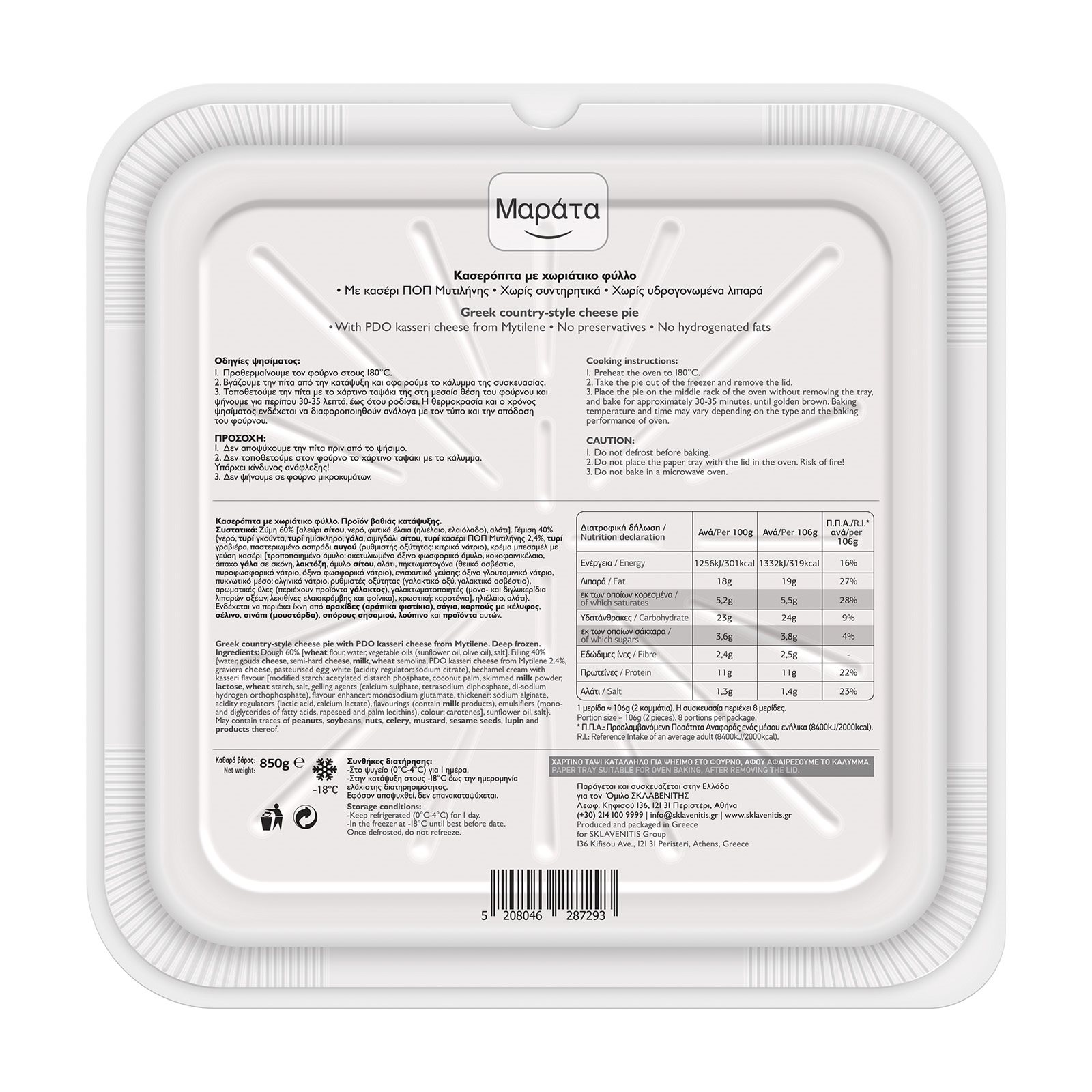 Γέμιση 40%: {νερό, ΤΥΡΙ γκούντα, ΤΥΡΙ ημίσκληρο, ΓΑΛΑ, σιμιγδάλι ΣΙΤΟΥ, ΤΥΡΙ κασέρι ΠΟΠ Μυτιλήνης 2,4%, ΤΥΡΙ γραβιέρα, παστεριωμένο ασπράδι ΑΥΓΟΥ (ρυθμιστής οξύτητας: κιτρικό νάτριο), κρέμα μπεσαμέλ με γεύση κασέρι [τροποποιημένο άμυλο: ακετυλιωμένο όξινο φωσφορικό άμυλο, κοκοφοινικέλαιο, άπαχο ΓΑΛΑ σε σκόνη, ΛΑΚΤΟΖΗ, άμυλο ΣΙΤΟΥ, αλάτι, πηκτωματογόνα (θετικό ασβέστιο, πυροφωσφορικό νάτριο, όξινο φωσφορικό νάτριο), ενισχυτικό γεύσης: όξινο γλουταμινικό νάτριο, πυκνωτικό μέσο: αλγινικό νάτριο, ρυθμιστές οξύτητας (γαλακτικό οξύ, γαλακτικό ασβέστιο), αρωματικές ύλες (περιέχουν προϊόντα ΓΑΛΑΚΤΟΣ), γαλακτωματοποιητές (μονο- και διγλυκερίδια λιπαρών οξέων, λεκιθίνες ελαιοκράμβης και φοίνικα), χρωστική: καροτένια), ηλιέλαιο, αλάτι).