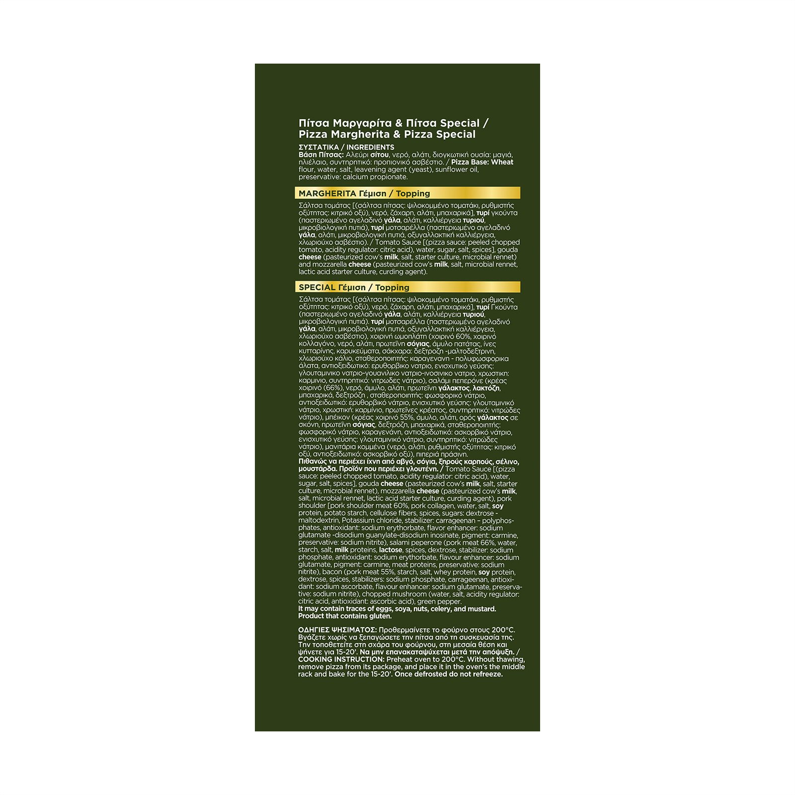 Πίτσα Σπέσιαλ - Γέμιση: Σάλτσα ντομάτας [(σάλτσα πίτσας: ψιλοκομμένο ντοματάκι, ρυθμιστής οξύτητας: κιτρικό οξύ), νερό, ζάχαρη, αλάτι, μπαχαρικά], ΤΥΡΙ Γκούντα, παστεριωμένο αγελαδινό ΓΑΛΑ, αλάτι, καλλιέργεια τυριού, μικροβιολογική πυτιά), ΤΥΡΙ μοτσαρέλλα (παστεριωμένο αγελαδινό ΓΑΛΑ, αλάτι, μικροβιολογική πυτιά, οξυναλλακτική καλλιέργεια, χλωριούχο ασβέστιο), χοιρινή ωμοπλάτη (χοιρινό 60%, χοιρινό κολλαγόνο, νερό, αλάτι, πρωτεΐνη ΣΟΓΙΑΣ, άμυλο πατάτας, ίνες κυτταρίνης, καρυκεύματα, σάκχαρα: δεξτρόζη -μαλτοδεξτρίνη, χλωριούχο κάλιο, σταθεροποιητής: καραγενάνη - πολυφωσφορικά άλατα, αντιοξειδωτικό: ερυθορβικό νάτριο, ενισχυτικό γεύσης: γλουταμινικό νατριο-γουανιλικο νατριο-ινοσινικό νάτριο, χρωστική: καρμίνιο, συντηρητικό: νιτρώδες νάτριο), σαλάμι πεπερόνε (κρέας χοιρινό (66%), νερό, άμυλο, αλάτι, πρωτεΐνη ΓΑΛΑΚΤΟΣ, ΛΑΚΤΟΖΗ, μπαχαρικά, δεξτρόζη, σταθεροποιητής: φωσφορικό νάτριο, αντιοξειδωτικό: ερυθορβικό νάτριο, ενισχυτικό γεύσης: γλουταμινικό νάτριο, χρωστική καρμίνιο, πρωτεΐνες κρέατος, συντηρητικό: νιτρώδες νάτριο), μπέικον (κρέας χοιρινό 55%, άμυλο, αλάτι, ορός ΓΑΛΑΚΤΟΣ σε σκόνη, πρωτεΐνη ΣΟΓΙΑΣ, δεξτρόζη, μπαχαρικά, σταθεροποιητής: φωσφορικό νάτριο, καραγενάνη, αντιοξειδωτικό: ασκορβικό νάτριο, ενισχυτικό γεύσης: γλουταμινικό νάτριο, συντηρητικό: νιτρώδες νάτριο), μανιτάρια κομμένα (νερό, αλάτι, ρυθμιστής οξύτητας: κιτρικό οξύ, αντιοξειδωτικό: ασκορβικό οξύ), πιπεριά πράσινη.
