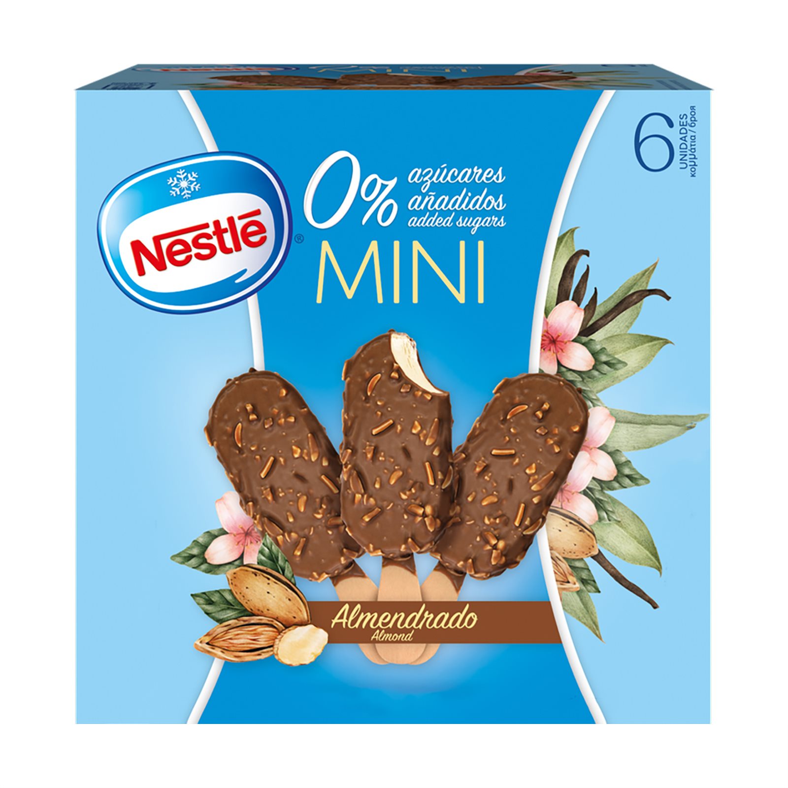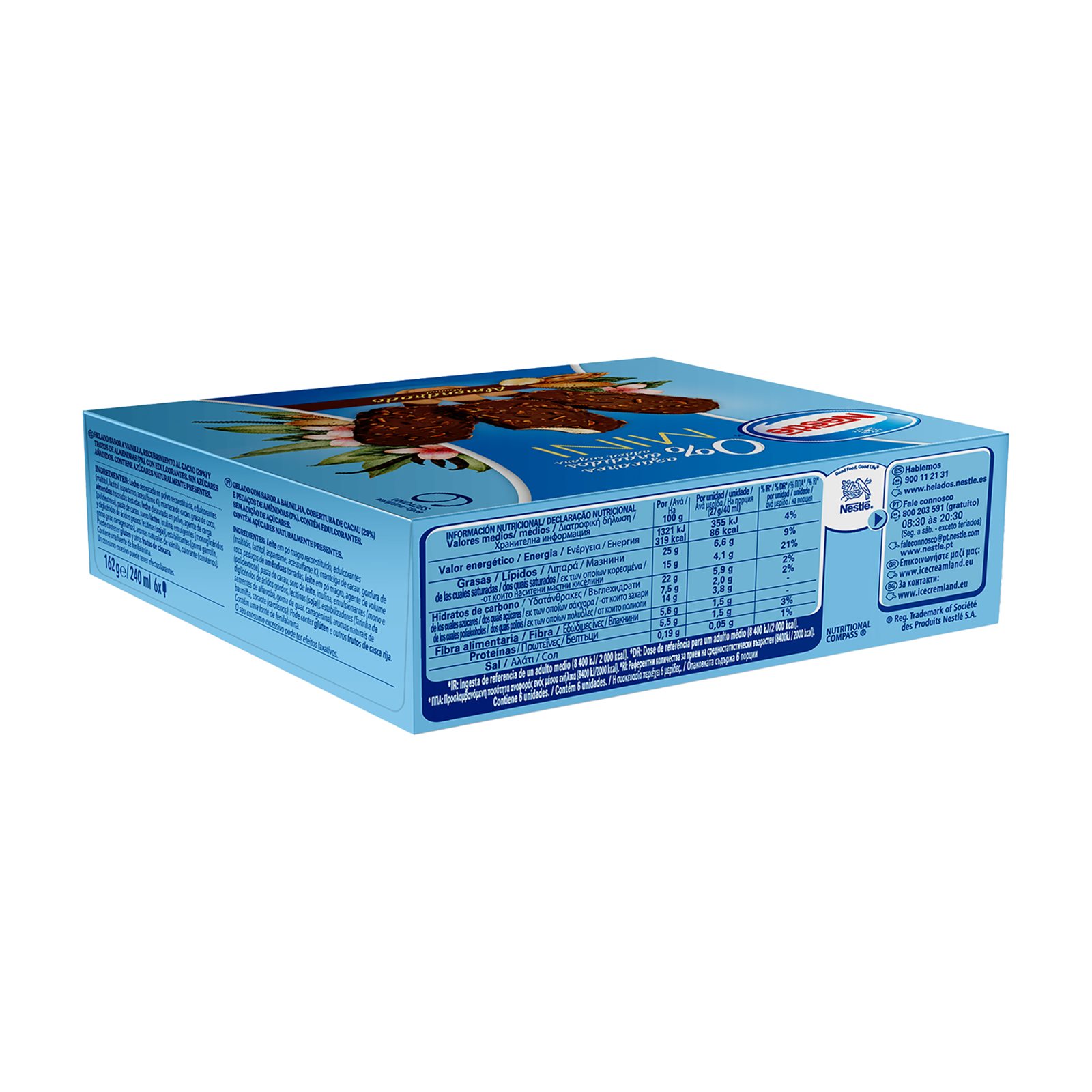 Ανασυσταθέν αποβουτυρωμένο ΓΑΛΑ, γλυκαντικά (μαλτιτόλες, λακτιτόλη, ασπαρτάμη, ακεσουλφάμη Κ), βούτυρο κακάο, κοκόλιπος, καβουρδισμένα κομμάτια ΑΜΥΓΔΑΛΟΥ, ΓΑΛΑ αποβουτυρωμένο σε σκόνη, διογκωτικό (πολυδεξτρόζη), κακαόμαζα, ορός ΓΑΛΑΚΤΟΣ σε σκόνη, ινουλίνη, γαλακτωματοποιητές (μονο- και διγλυκερίδια λιπαρών οξέων, λεκιθίνες ΣΟΓΙΑΣ), σταθεροποιητές (κόμμι χαρουπιών, κόμμι γκουάρ, καραγενάνη), φυσική αρωματική ύλη βανίλιας, χρωστική ουσία (καροτένια).Μπορεί να περιέχει ΔΗΜΗΤΡΙΑΚΑ που περιέχουν ΓΛΟΥΤΕΝΗ και άλλους ΚΑΡΠΟΥΣ με ΚΕΛΥΦΟΣ.