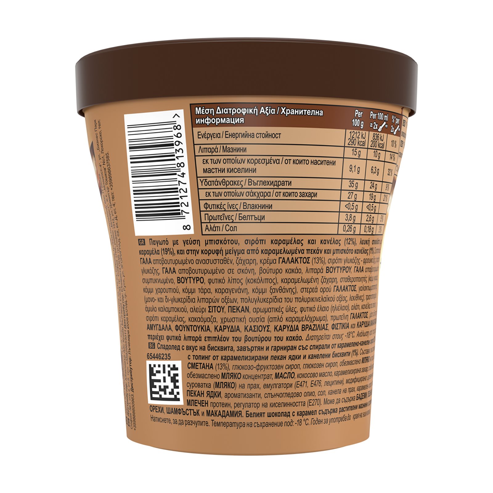 ΓΑΛΑ αποβουτυρωμένο ανασυσταθέν, ζάχαρη, κρέμα ΓΑΛΑΚΤΟΣ (13%), σιρόπι γλυκόζης - φρουκτόζης, σιρόπι γλυκόζης, ΓΑΛΑ αποβουτυρωμένο σε σκόνη, βούτυρο κακάο, λιπαρά ΒΟΥΤΥΡΟΥ, ΓΑΛΑ αποβουτυρωμένο συμπυκνωμένο, ΒΟΥΤΥΡΟ, φυτικό λίπος (κοκόλιπος), καραμελωμένη ζάχαρη, σταθεροποιητές (κόμμι γκουάρ, κόμμι χαρουπιού, κόμμι τάρα, καραγενάνη, κόμμι ξανθάνης), στερεά ορού ΓΑΛΑΚΤΟΣ, γαλακτωματοποιητές (μονο- και δι-γλυκερίδια λιπαρών οξέων, πολυγλυκερίδια του πολυρικινελαϊκού οξέος, λεκιθίνες), τροποποιημένο άμυλο καλαμποκιού, αλεύρι ΣΙΤΟΥ, ΠΕΚΑΝ, αρωματικές ύλες, φυτικό έλαιο (ηλιέλαιο), αλάτι, κανέλα σε σκόνη, σιρόπι καραμέλας, κακαόμαζα, χρωστική ουσία (απλό καραμελόχρωμα), πρωτεΐνη ΓΑΛΑΚΤΟΣ, μέσο οξίνισης (γαλακτικό οξύ).