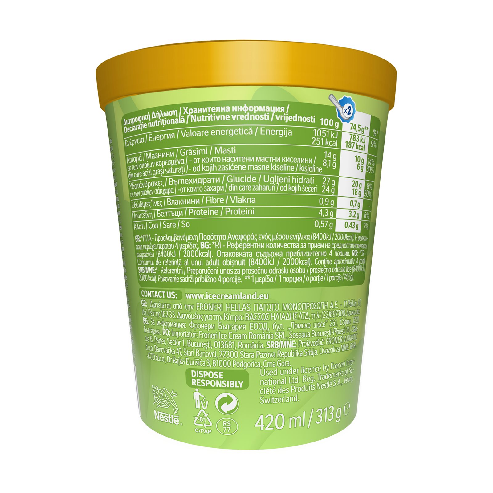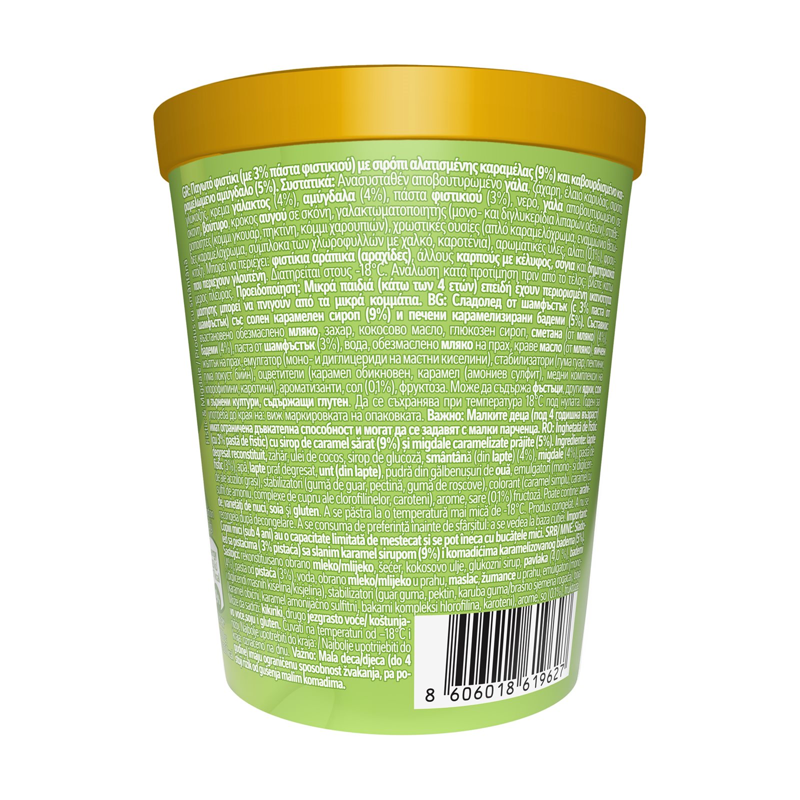 Παγωτό φιστίκι (με 3% πάστα φιστικιού) με σιρόπι αλατισμένης καραμέλας (9%) και καβουρδισμένο καραμελωμένο αμύγδαλο (5%).