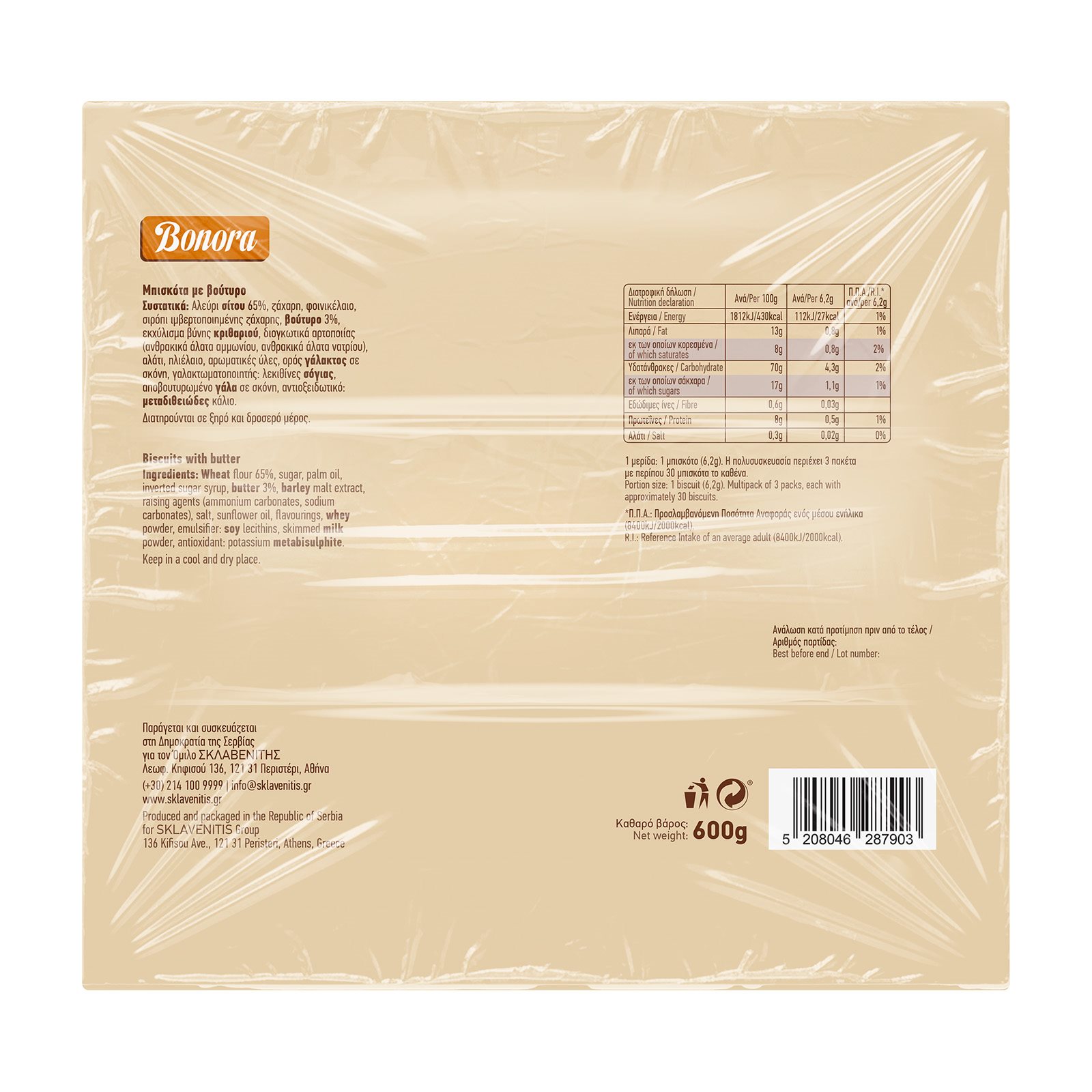 1 μερίδα: 1 μπισκότο (6,2g). Η πολυσυσκευασία περιέχει 3 πακέτα με περίπου 30 μπισκότα το καθένα. |