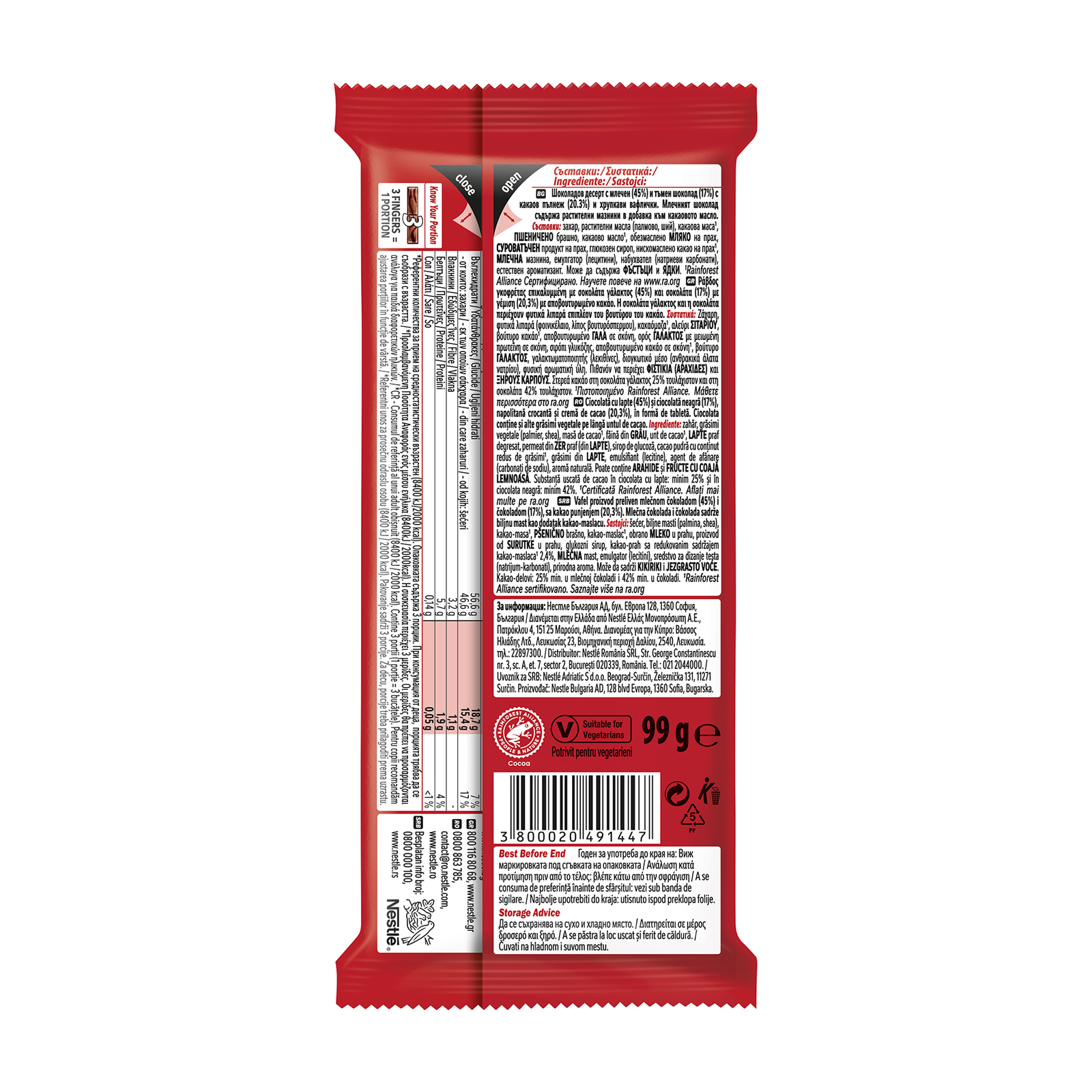 Ζάχαρη, φυτικά λιπαρά (φοινικέλαιο, λίπος βουτυρόσπερμου), κακαόμαζα*, αλεύρι ΣΙΤΑΡΙΟΥ, βούτυρο κακάο*, αποβουτυρωμένο ΓΑΛΑ σε σκόνη, ορός ΓΑΛΑΚΤΟΣ με μειωμένη πρωτεϊνη σε σκόνη, σιρόπι γλυκόζης, αποβουτυρωμένο κακάο σε σκόνη*, βούτυρο ΓΑΛΑΚΤΟΣ, γαλακτωματοποιητής (λεκιθίνες), διογκωτικό μέσο (ανθρακικά άλατα νατρίου), φυσική αρωματική ύλη.