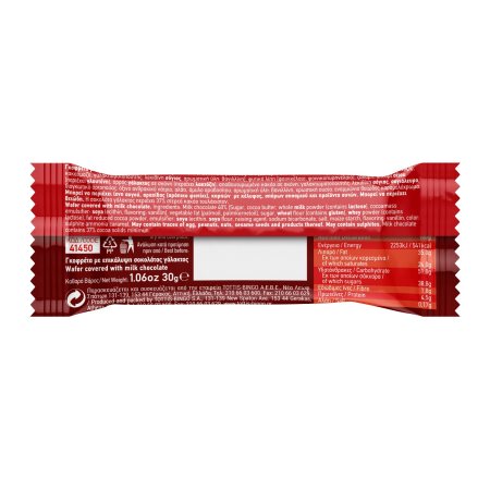 Σοκολάτα ΓΑΛΑΚΤΟΣ 40% (ζάχαρη, βούτυρο κακάο, κακαόμαζα, ΓΑΛΑ πλήρες σε σκόνη, γαλακτωματοποιητής: λεκιθίνη ΣΟΓΙΑΣ, αρωματική ύλη: βανιλίνη), φυτικά λίπη (φοινικέλαιο, φοινικοπυρηνέλαιο) , ζάχαρη, αλεύρι ΣΙΤΟΥ, ορός ΓΑΛΑΚΤΟΣ σε σκόνη, γέμιση 51% (ζάχαρη, μερικώς αποβουτυρωμένο κακάο σκόνη, γαλακτωματοποιητής: λεκιθίνη ΣΟΓΙΑΣ, ΣΟΓΙΑΛΕΥΡΟ, διογκωτικό αρτοποιΐας: όξινο ανθρακικό νάτριο, αλάτι, άμυλο αραβοσίτου, αρωματική ύλη: βανιλίνη, χρωστική: εναμμώνιο ΘΕΙΩΔΕΣ καραμελόχρωμα.
