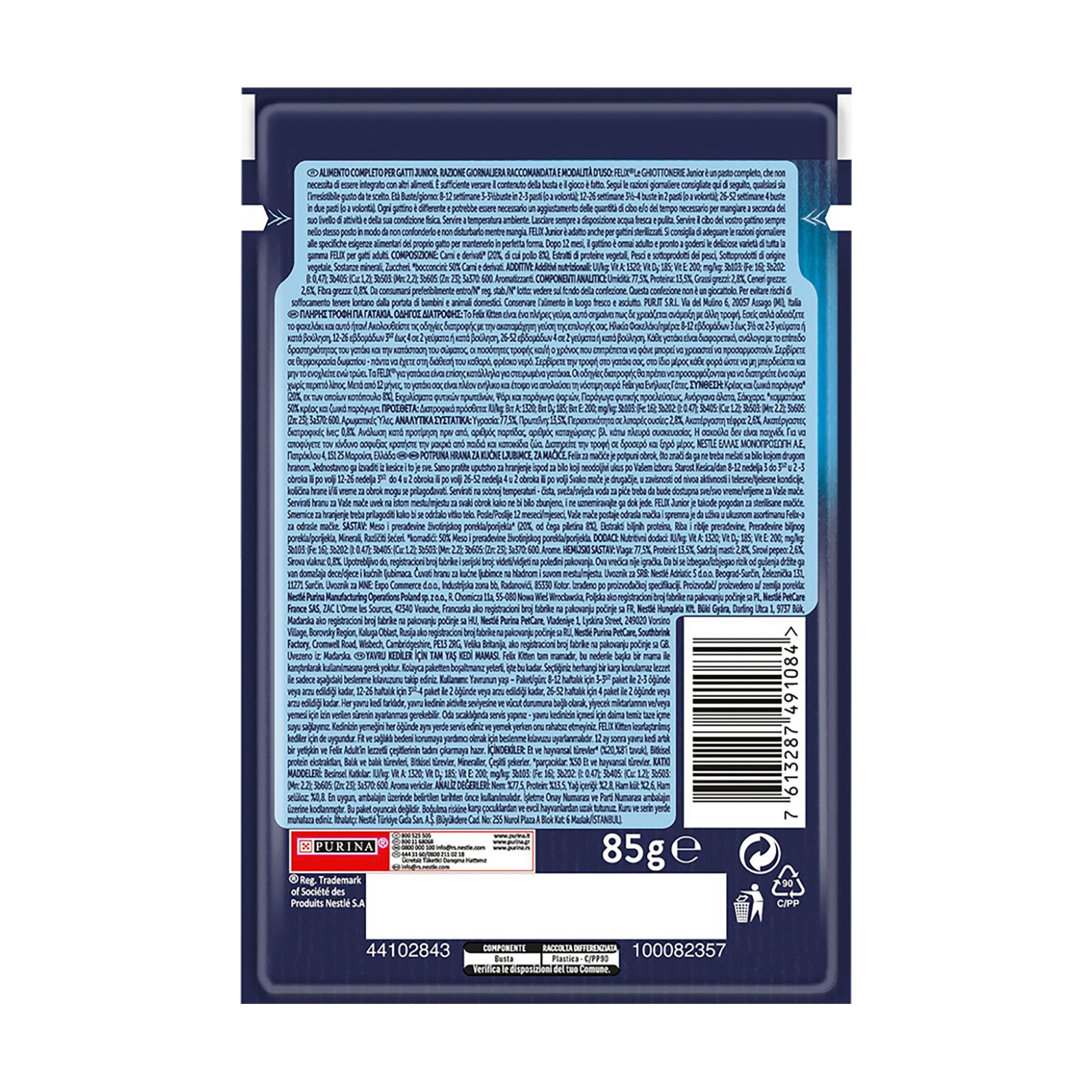 Φακελάκι υγρής τροφής για Γατάκια. Είναι ειδικά παρασκευασμένα με αληθινά, τρυφερά κομμάτια κρέατος σε ζουμερό ζελέ.