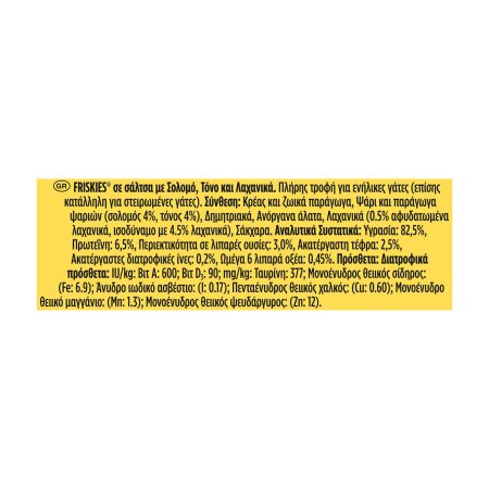 Αναλυτικά συστατικά: Υγρασία: 82,5%, πρωτεΐνη: 6,5%, περιεκτικότητα σε λιπαρές ουσίες: 3,0%, ακατέργαστη τέφρα: 2,5%, ακατέργαστες διατροφικές ίνες: 0,2%, ωμέγα 6 λιπαρά οξέα: 0,45%.