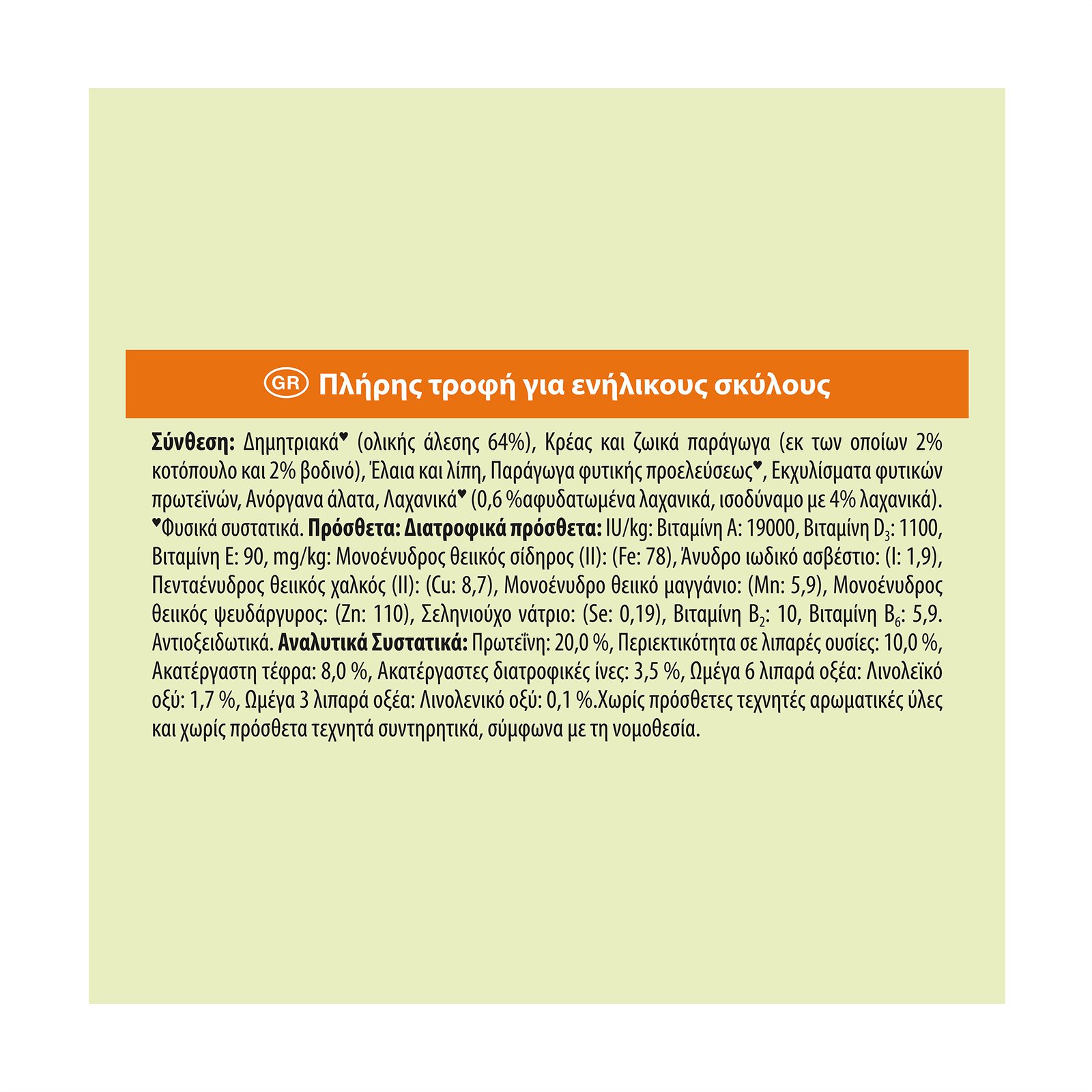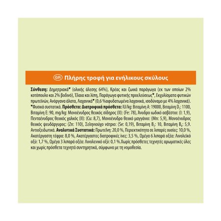 Αναλυτικά Συστατικά: Πρωτεΐνη: 20,0 %, Περιεκτικότητα σε λιπαρές ουσίες: 10,0 %, Ακατέργαστη τέφρα: 8,0%, Ακατέργαστες διατροφικές ίνες: 3,5 %, Ωμέγα 6 λιπαρά οξέα: Λινολεϊκό οξύ: 1,7%, Ωμέγα 3 λιπαρά οξέα: Λινολενικό οξύ: 0,1%.Χωρίς πρόσθετες τεχνητές αρωματικές ύλες και χωρίς πρόσθετα τεχνητά συντηρητικά, σύμφωνα με τη νομοθεσία.