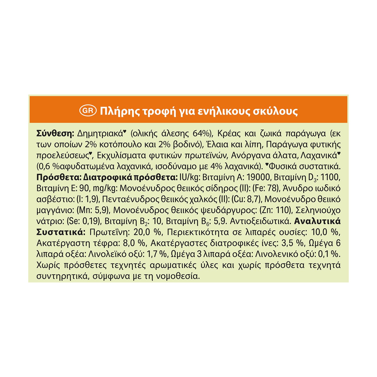 Αναλυτικά Συστατικά: Πρωτεΐνη: 20,0 %, Περιεκτικότητα σε λιπαρές ουσίες: 10,0 %, Ακατέργαστη τέφρα: 8,0%, Ακατέργαστες διατροφικές ίνες: 3,5 %, Ωμέγα 6 λιπαρά οξέα: Λινολεϊκό οξύ: 1,7%, Ωμέγα 3 λιπαρά οξέα: Λινολενικό οξύ: 0,1%.Χωρίς πρόσθετες τεχνητές αρωματικές ύλες και χωρίς πρόσθετα τεχνητά συντηρητικά, σύμφωνα με τη νομοθεσία.