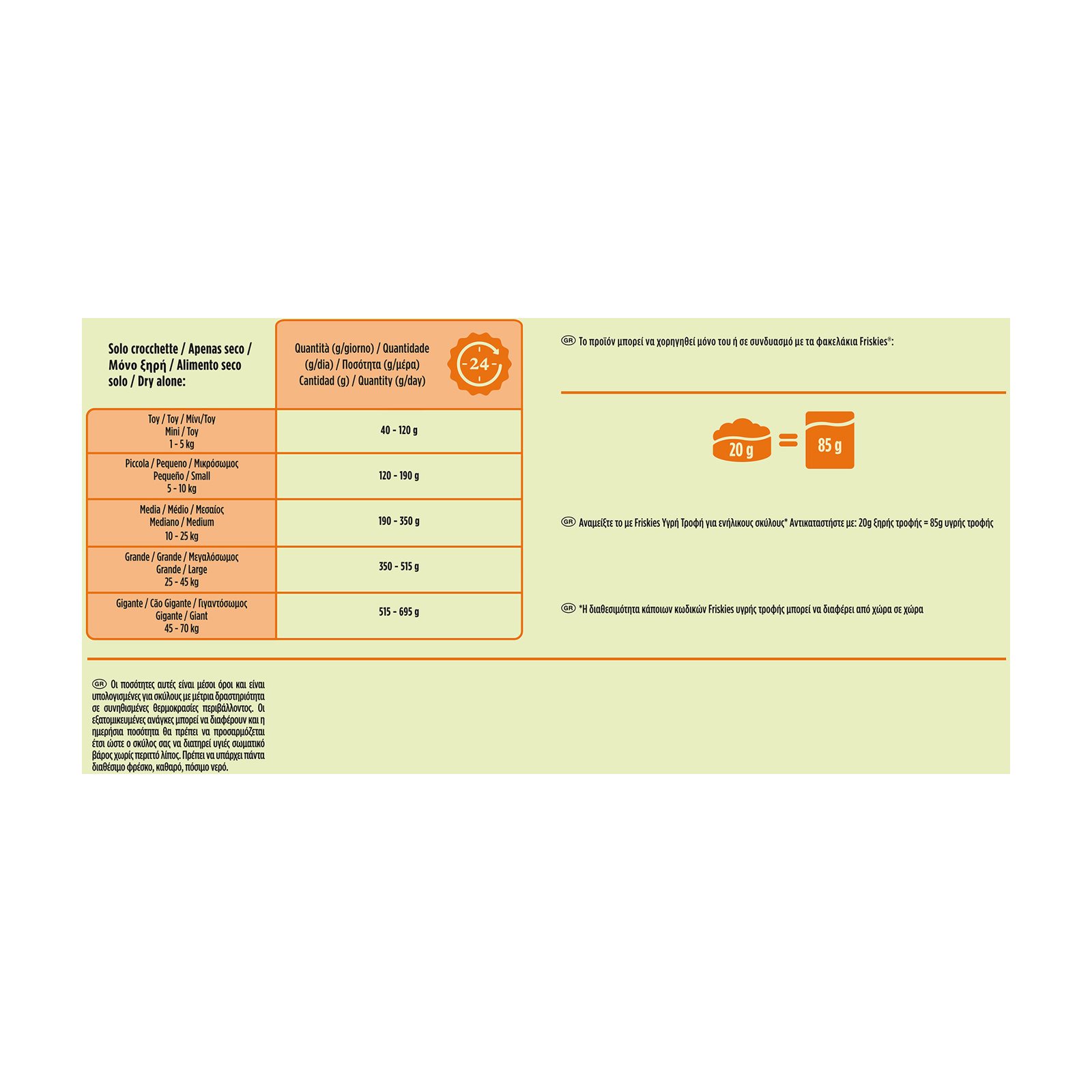 Αντικαταστήστε 20g ξηρής τροφής = 85g υγρής.