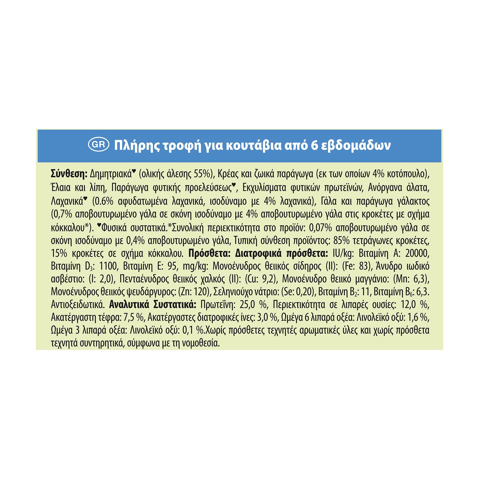 ισοδύναμο με 0,4% αποβουτυρωμένο γάλα, Τυπική σύνθεση προϊόντος: 85% τετράγωνες κροκέτες, 15% κροκέτες σε σχήμα κόκκαλου.