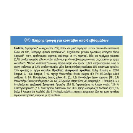 Αναλυτικά Συστατικά: Πρωτεΐνη: 25,0 %, Περιεκτικότητα σε λιπαρές ουσίες: 12,0 %, Ακατέργαστη τέφρα: 7,5 %, Ακατέργαστες διατροφικές ίνες: 3,0 %, Ωμέγα 6 λιπαρά οξέα: Λινολεϊκό οξύ: 1,6 %, Ωμέγα 3 λιπαρά οξέα: Λινολεϊκό οξύ: 0,1%. Χωρίς πρόσθετες τεχνητές αρωματικές ύλες και χωρίς πρόσθετα τεχνητά συντηρητικά, σύμφωνα με τη νομοθεσία.