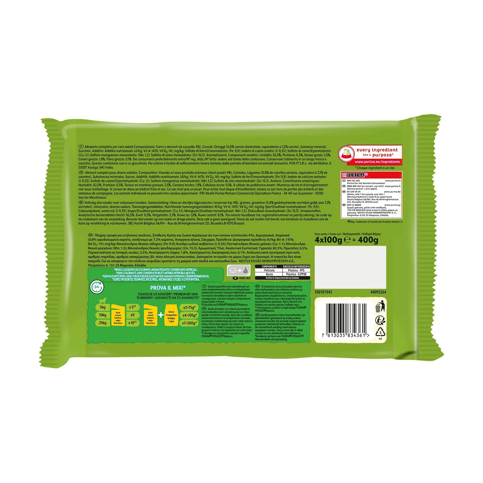 Κρέας και ζωικά παράγωγα (εκ των οποίων κοτόπουλο 4%), δημητριακά, λαχανικά (0,8% αφυδατωμένα καρότα, ισοδύναμο με 7,2% καρότα), ανόργανα άλατα, σάκχαρα.