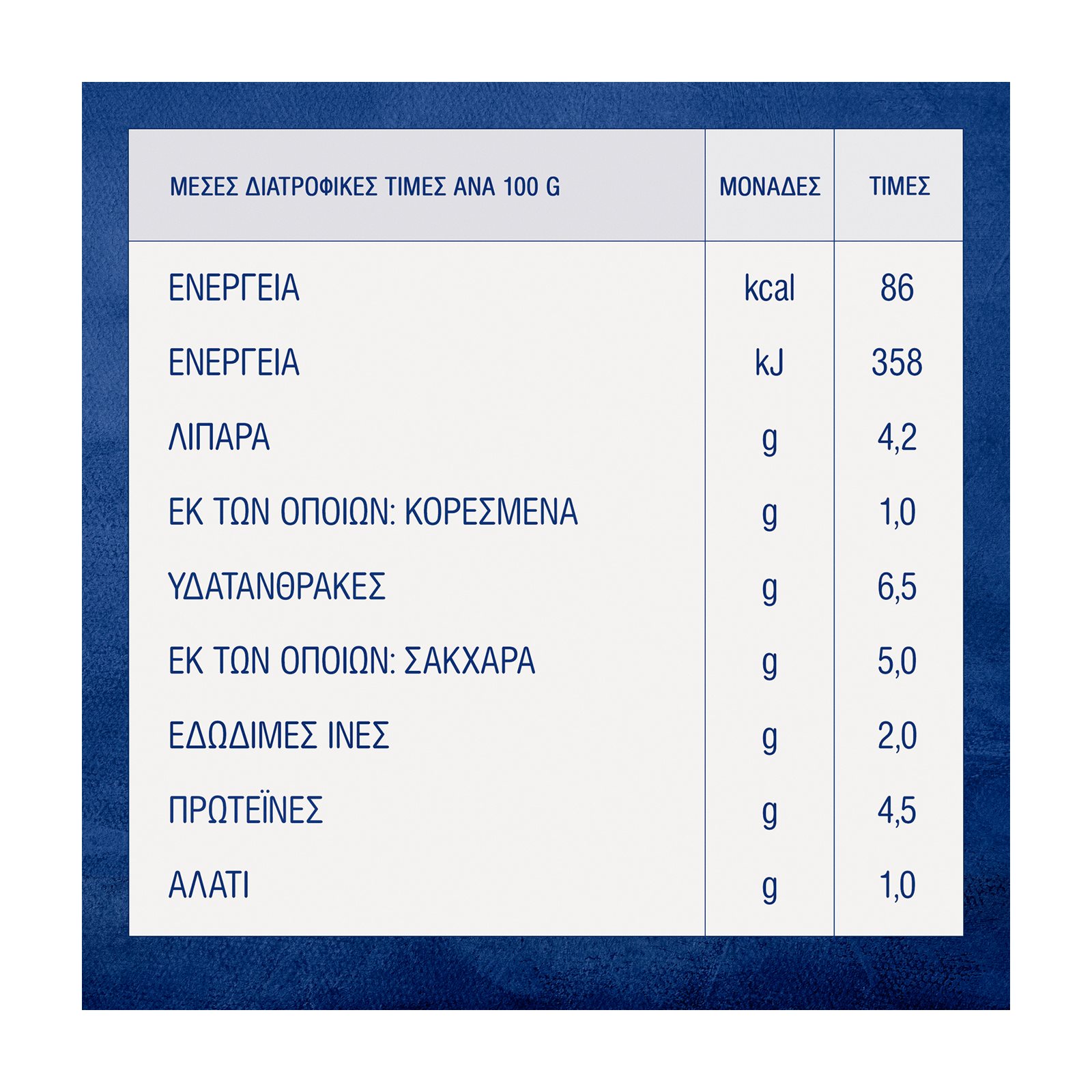 | Ενέργεια | 358kJ/86kcal |