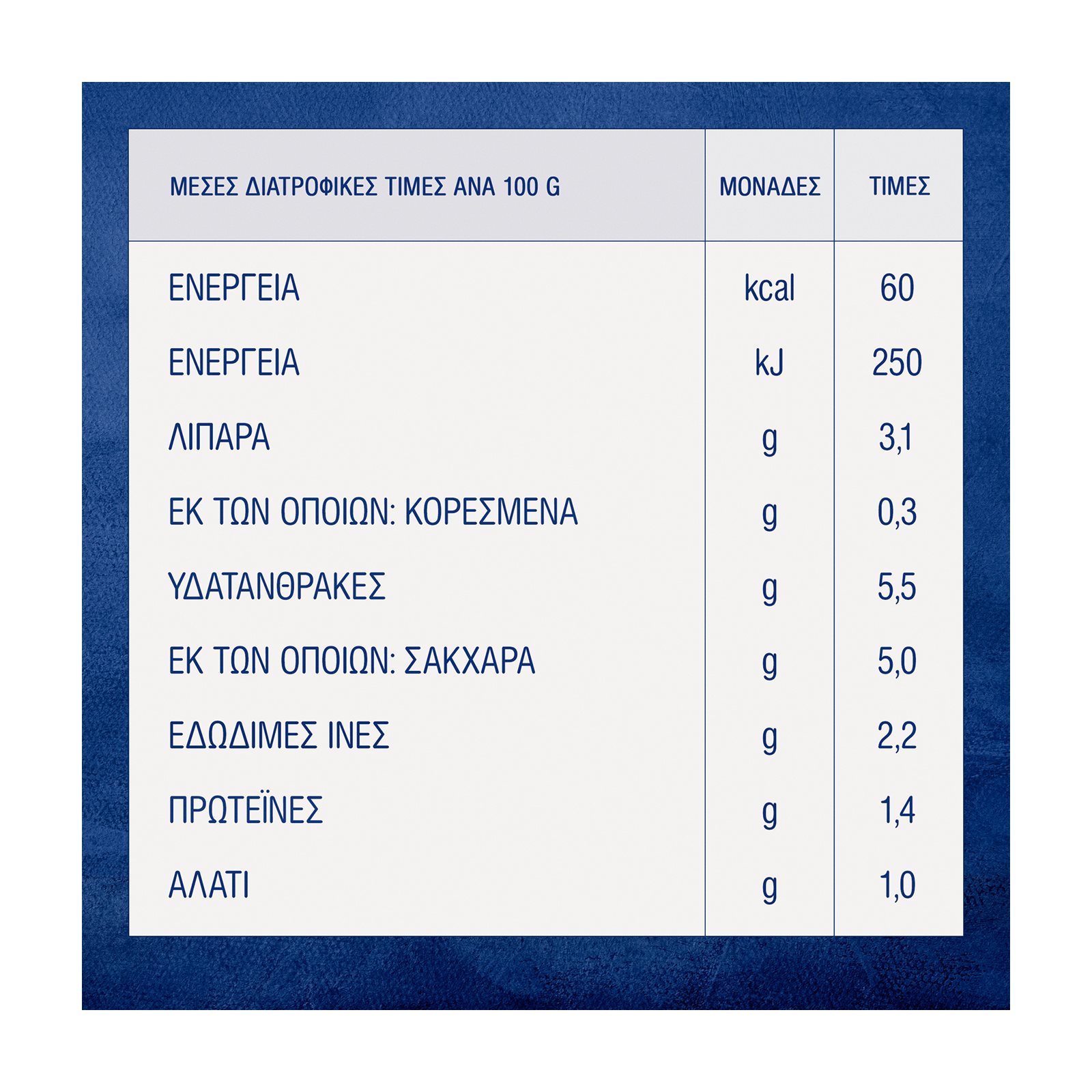 | Ενέργεια | 250kJ/60kcal |