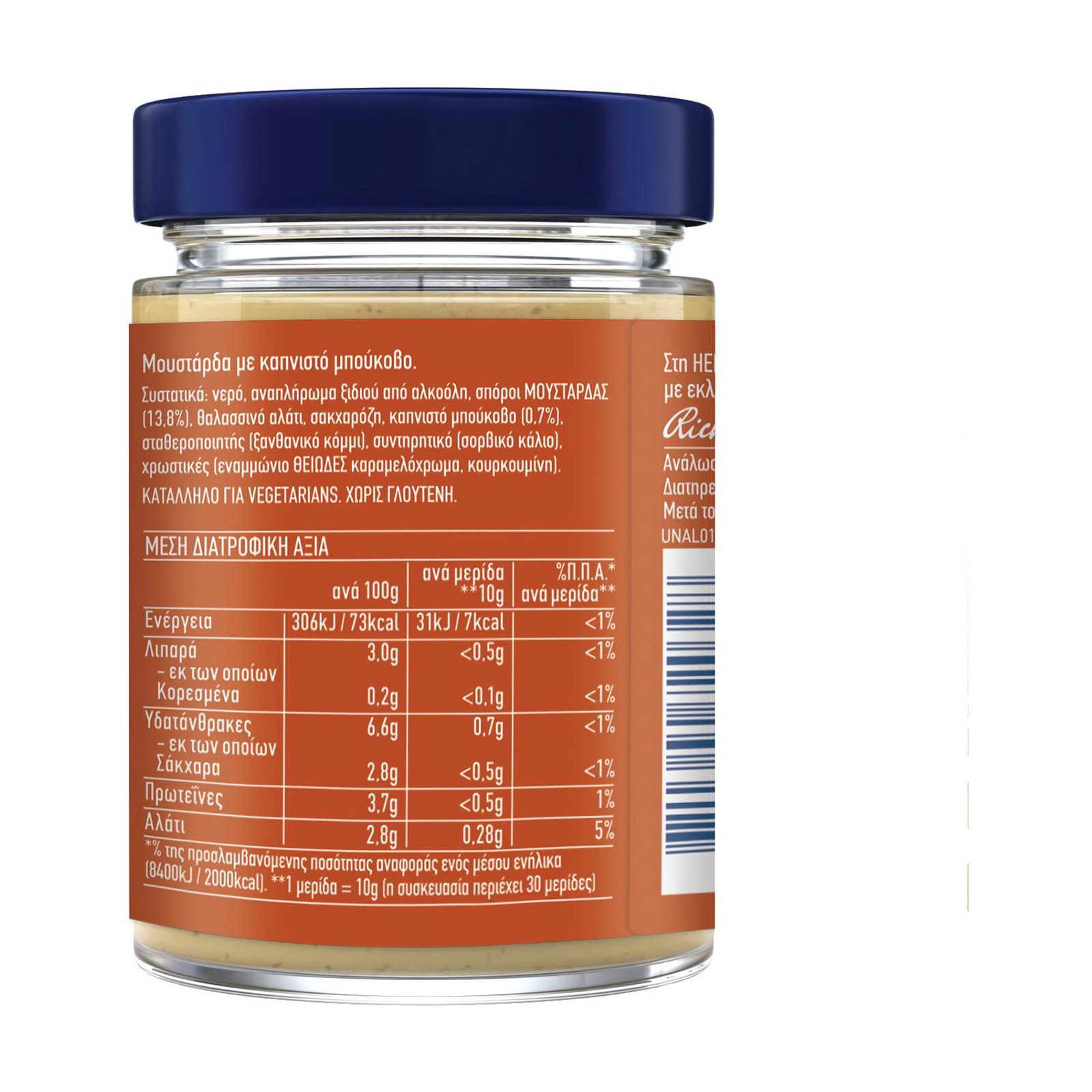Νερό, αναπλήρωμα ξιδιού από αλκοόλη, σπόροι ΜΟΥΣΤΑΡΔΑΣ (13,8%), θαλασσινό αλάτι, σακχαρόζη, καπνιστό μπούκοβο (0,7%), σταθεροποιητής (ξανθανικό κόμμι), συντηρητικό (σορβικό κάλιο), χρωστικές (εναμμώνιο ΘΕΙΩΔΕΣ καραμελόχρωμα, κουρκουμίνη).