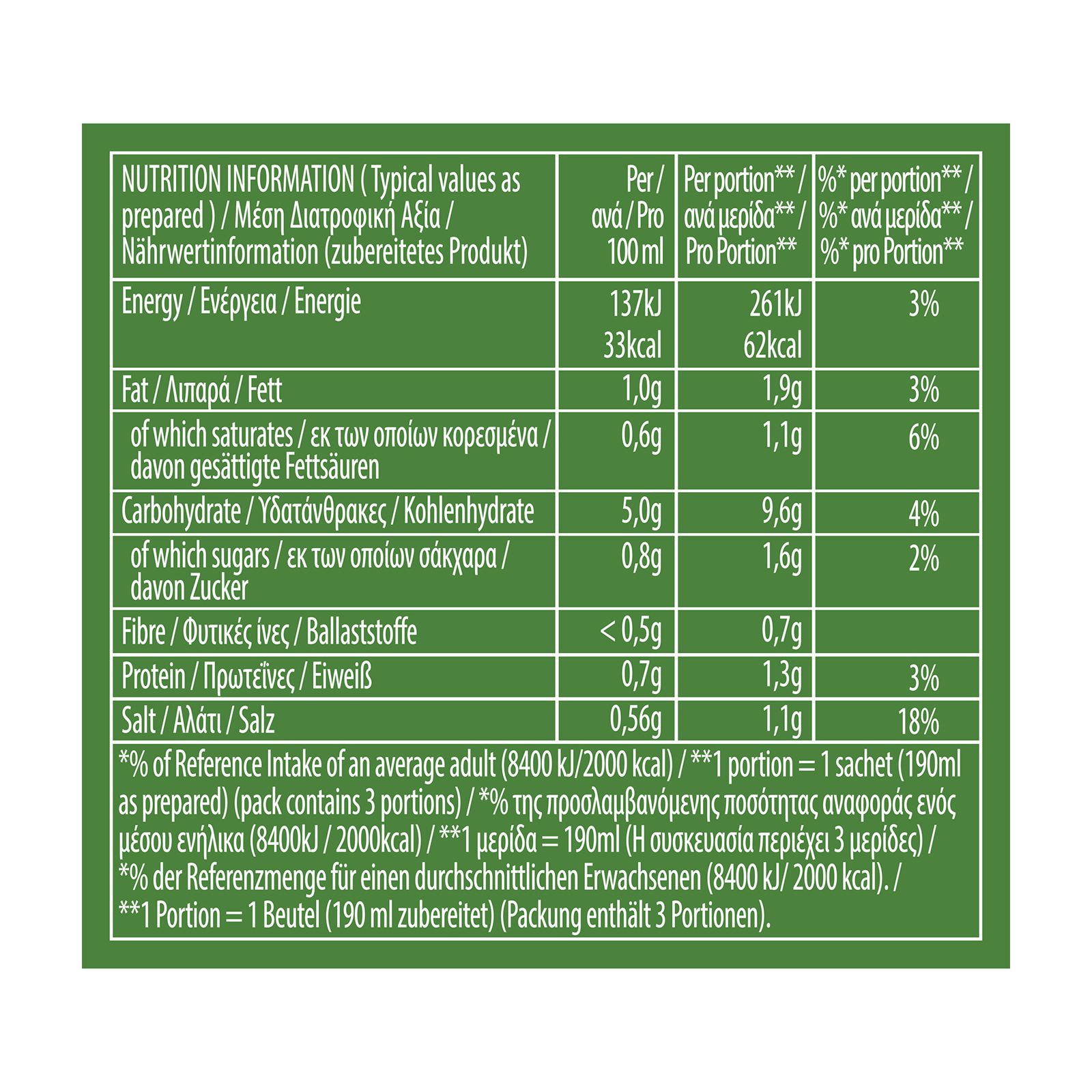 ** 1 μερίδα=190ml (Η συσκευασία περιέχει 3 μερίδες) |