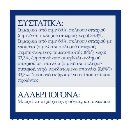 Zυμαρικά από σιμιγδάλι σκληρού ΣΙΤΑΡΙΟΥ (σιμιγδάλι σκληρού ΣΙΤΑΡΙΟΥ, νερό) 33,3%, ζυμαρικά από σιμιγδάλι σκληρού ΣΙΤΑΡΙΟΥ με ντομάτα (σιμιγδάλι σκληρού ΣΙΤΑΡΙΟΥ, συμπυκνωμένος τοματοπολτός (8%*), νερό) 33,3%, ζυμαρικά από σιμιγδάλι σκληρού ΣΙΤΑΡΙΟΥ με σπανάκι (σιμιγδάλι σκληρού ΣΙΤΑΡΙΟΥ, νερό, αφυδατωμένο σπανάκι (0,6%*)) 33,3%.