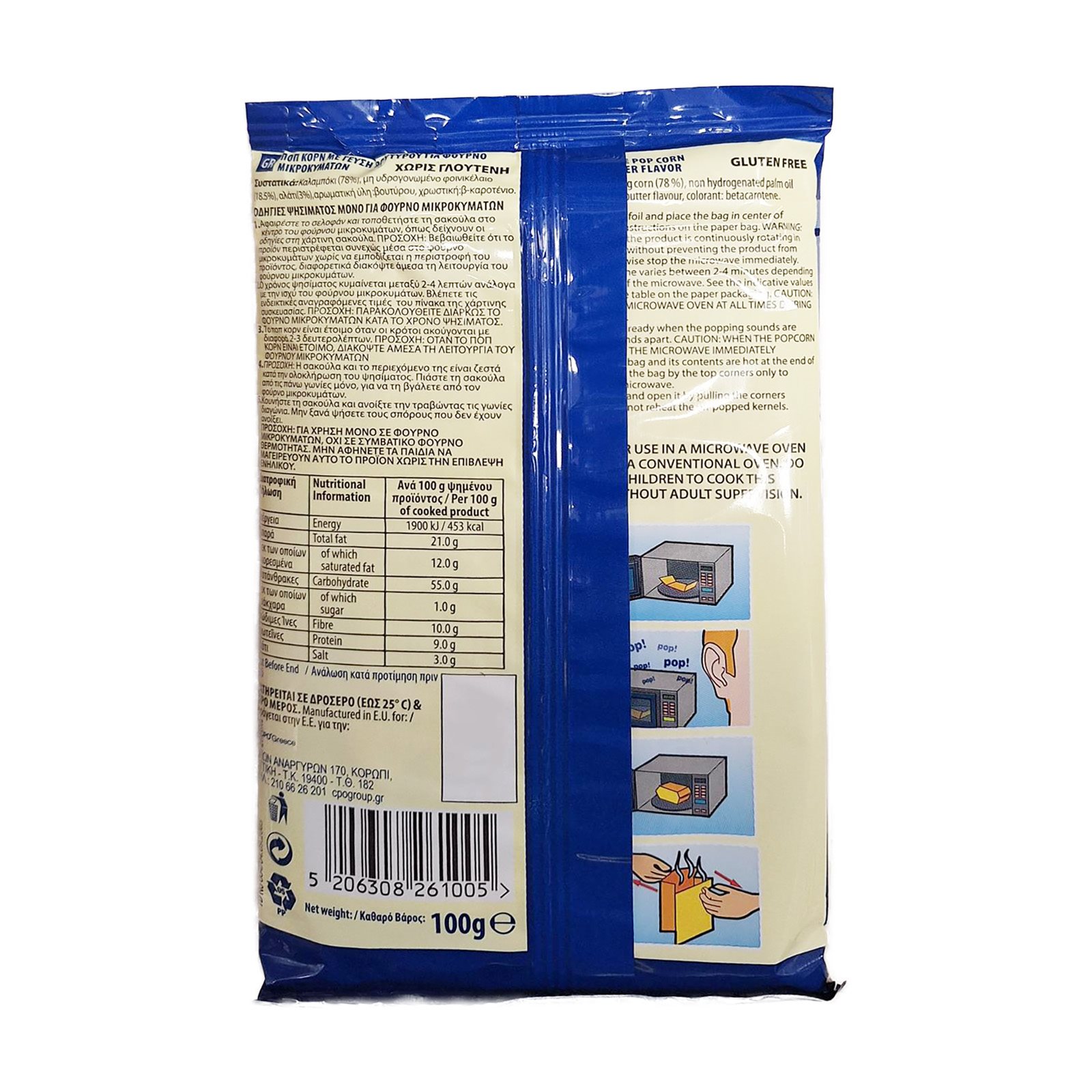 Καλαμπόκι 78%, μη υδρογονωμένο φοινικέλαιο 18,5%, αλάτι 3%, αρωματική ύλη: βουτύρου, χρωστική: β-καροτένιο.